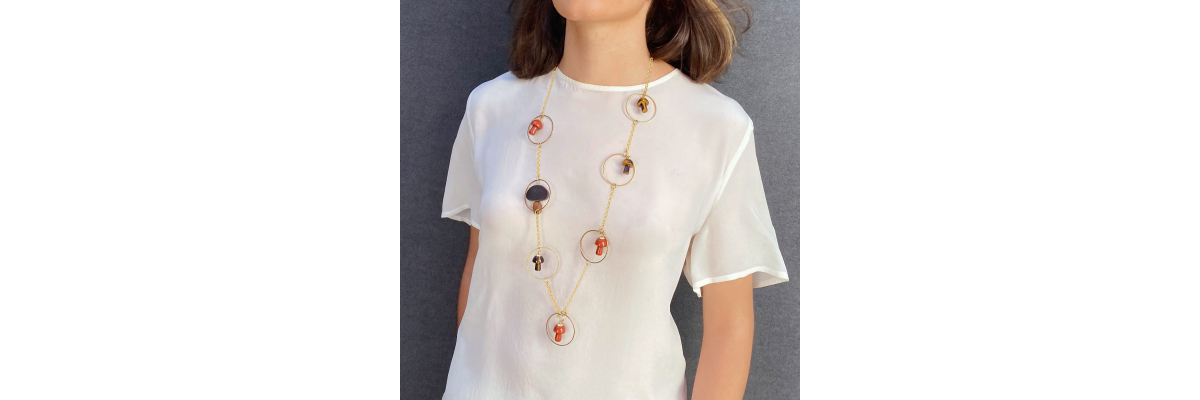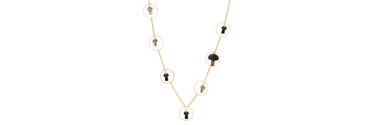 • Davinia long necklace with dalmatian jasper, onyx and ebony wood mushrooms.