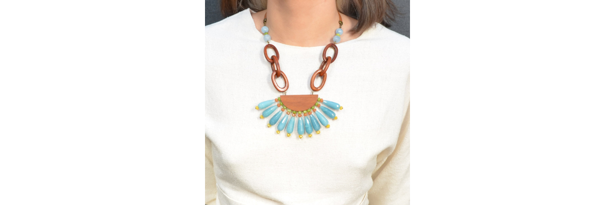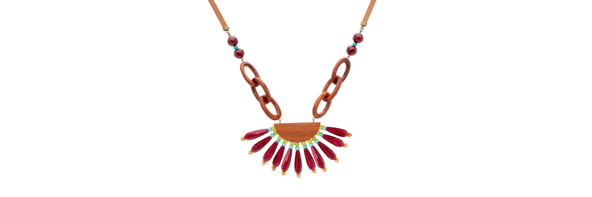 Collar Ingrid corto con ágatas color fresa, cuero y eslabones de madera de Bayong. -Peso 88 g -Longitud 29 cm -Metal: aleación dorado viejo -Rojo/marrón -Al ser materiales naturales y estar trabajados a mano, pueden variar ligeramente en tamaño, forma y color.