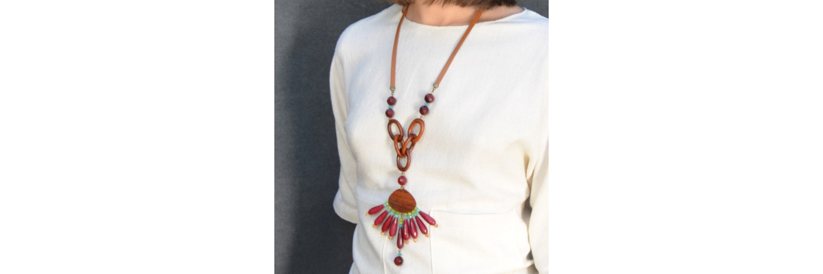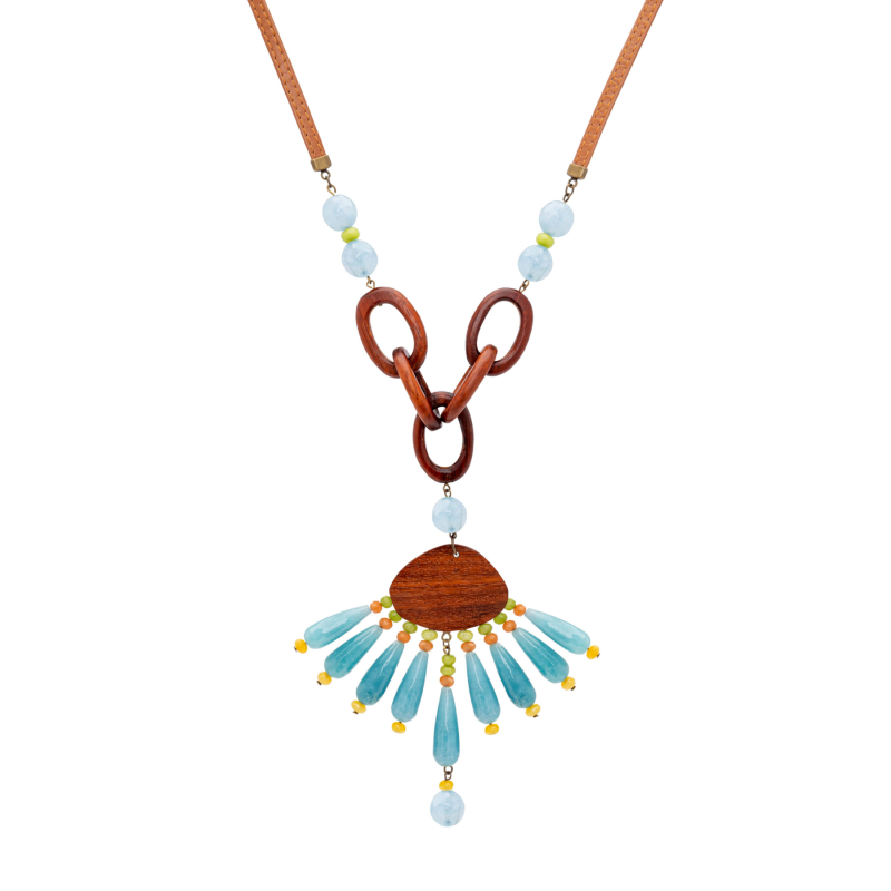 • Ingrid Y-shape necklace with blue agate and bayong wood.