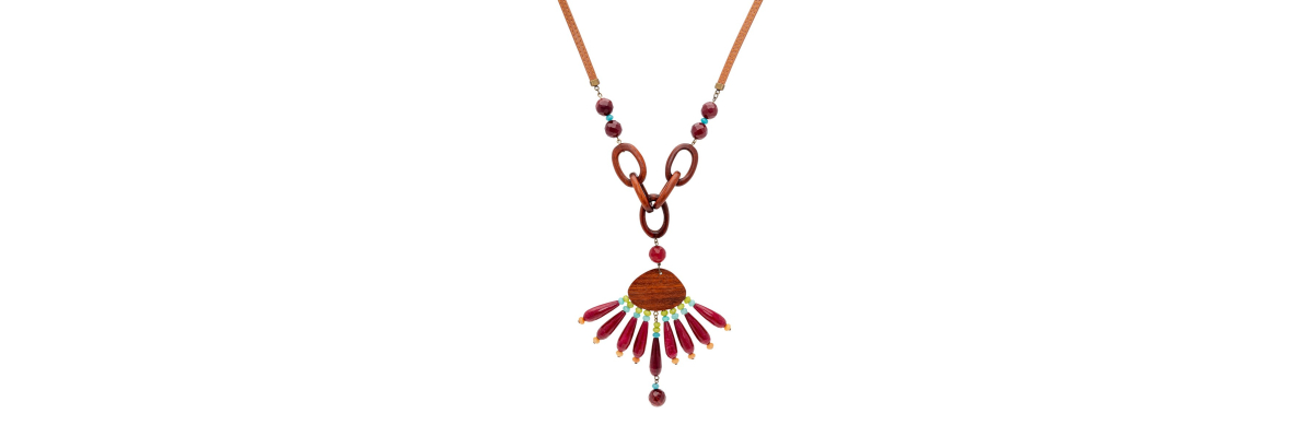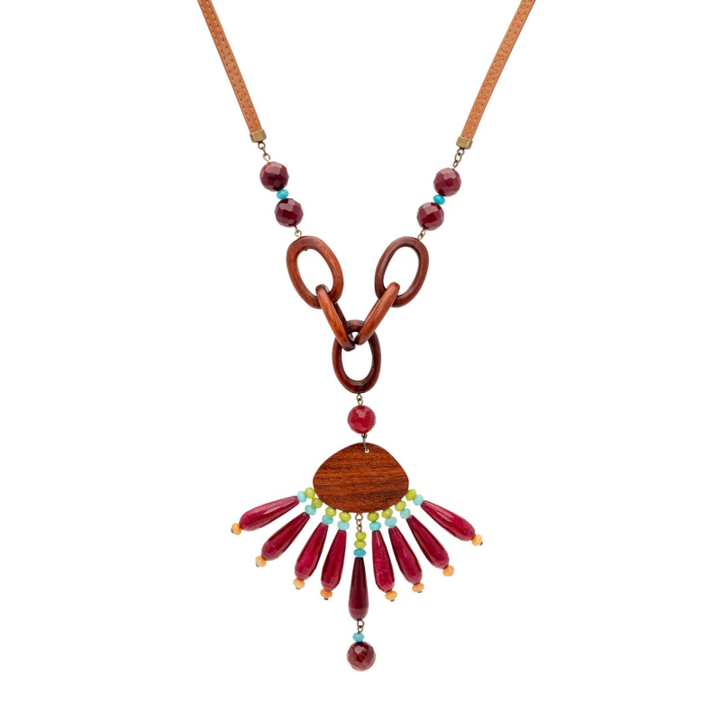 Collar Ingrid forma Y con ágatas color color fresa, cuero y eslabones de madera de Bayong. -Peso 95 g -Longitud 52 cm -Metal: aleación dorado viejo -Rojo/marrón -Al ser materiales naturales y estar trabajados a mano, pueden variar ligeramente en tamaño, forma y color.