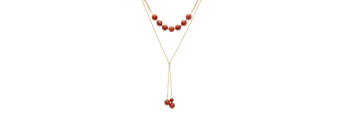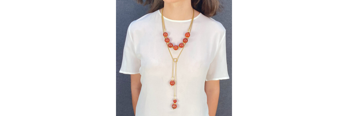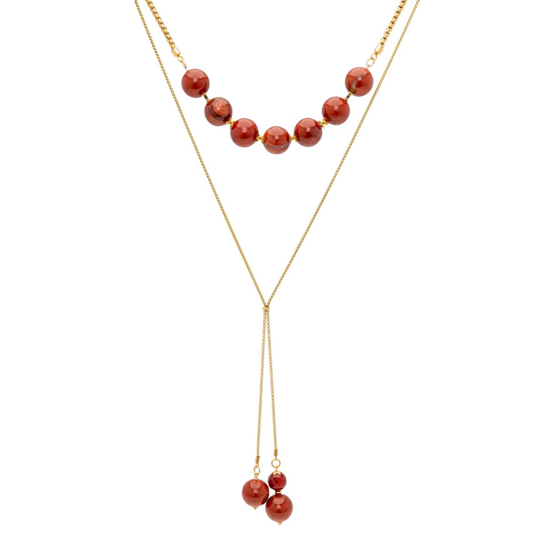 • Daniella Y shape necklace with large red jasper and carnelian balls.