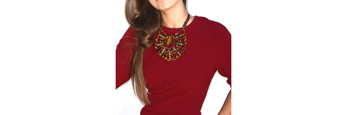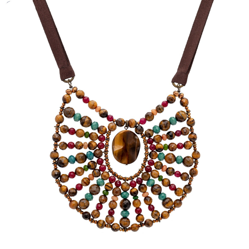 Collar Marlett con ojo de tigre, ágatas, cristal de Bohemia y cinta de grossgrain marrón. -Peso 123 g -Longitud 27 cm -Metal: aleación dorado viejo -Marrón/multicolor -Al ser materiales naturales y estar trabajados a mano, pueden variar ligeramente en tamaño, forma y color.