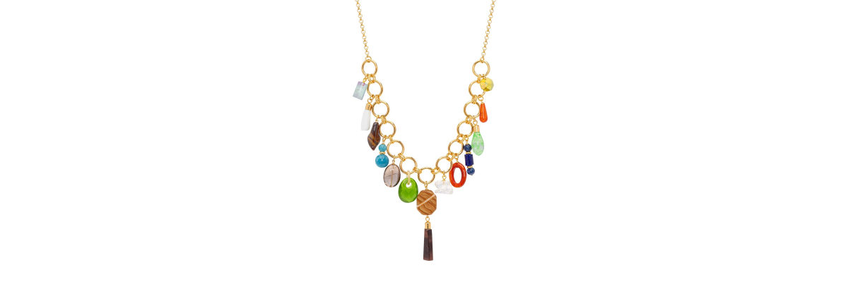 Collar Valentina corto con ágatas, cuarzo, lapislàzuli, jade, cornalina, jaspe paisaje, turmalina, ojo de tigre y cristal de Murano y Swarovski. -Peso 105 g -Longitud 34 cm -Metal: acero bañado en oro -Multicolor/dorado -Al ser materiales naturales y estar trabajados a mano, pueden variar ligeramente en tamaño, forma y color.