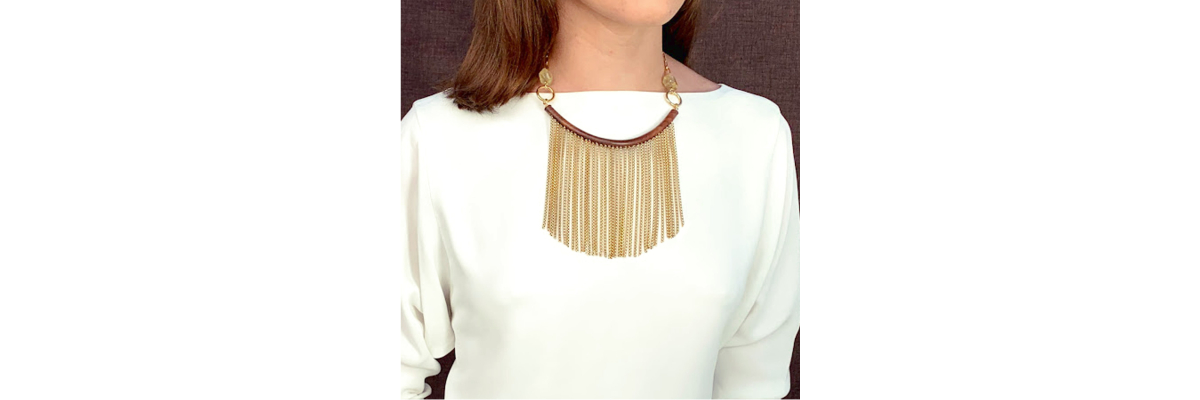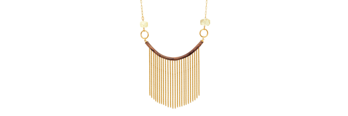 Collar corto Gabriella con madera de ébano, citrino y flecos de metal. -Peso 64 g -Longitud 30 cm -Metal: acero bañado en oro -Marrón/dorado/amarillo -Al ser materiales naturales y estar trabajados a mano, pueden variar ligeramente en tamaño, forma y color.