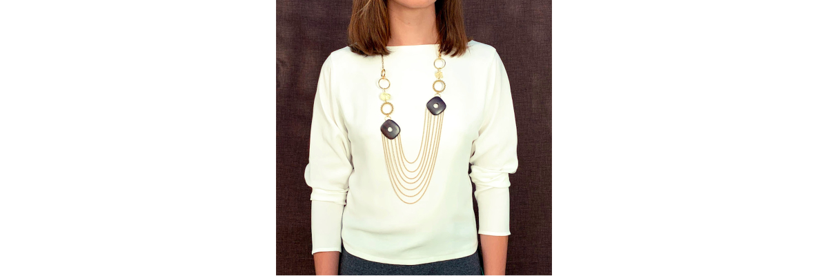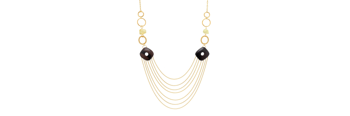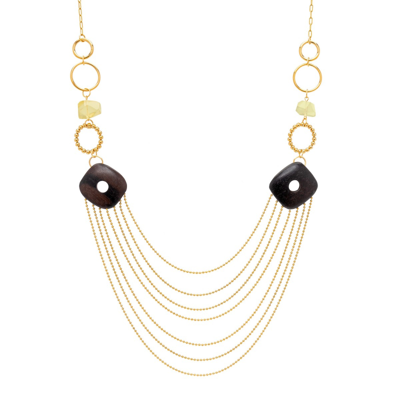 Collar largo Gabriella con madera de ébano, citrino y varias vueltas de metal. -Peso 67 g -Longitud 50 cm -Metal: acero bañado en oro -Marrón/dorado/amarillo -Al ser materiales naturales y estar trabajados a mano, pueden variar ligeramente en tamaño, forma y color.