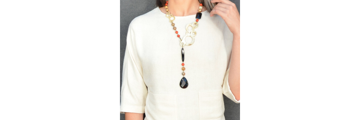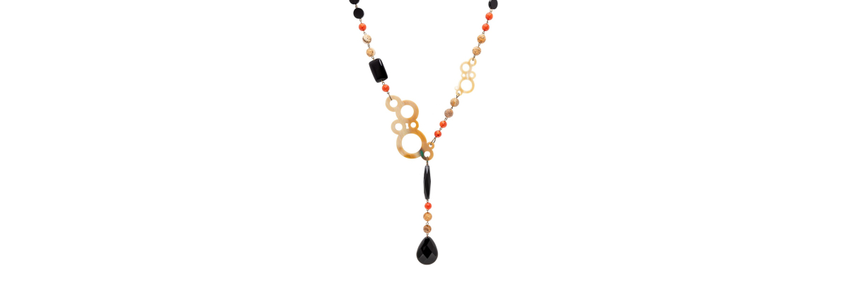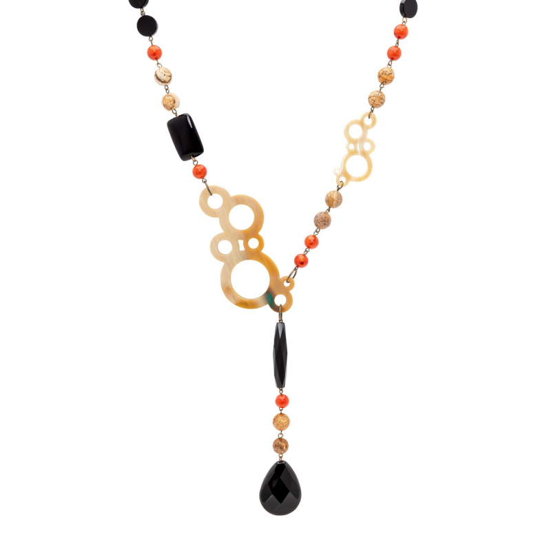 • Gaia Y shaped necklace with horn, landscape jasper, onyx and coral.