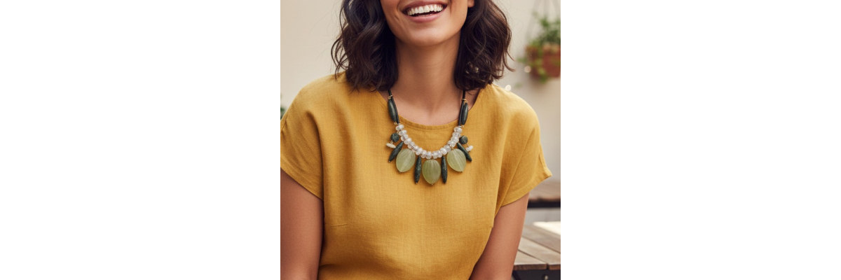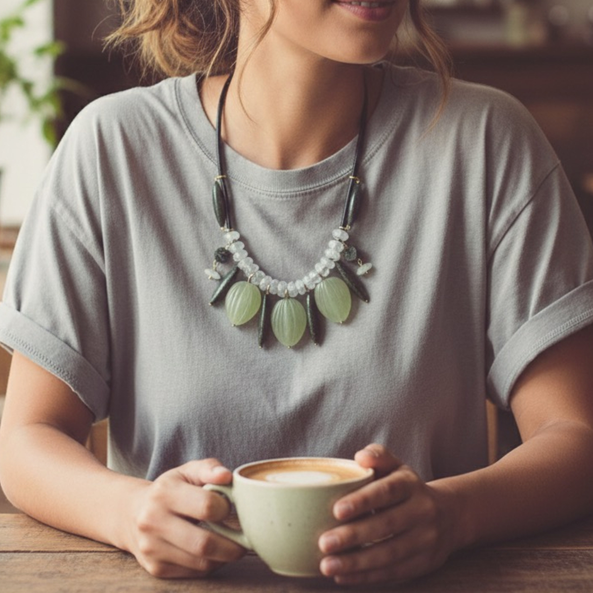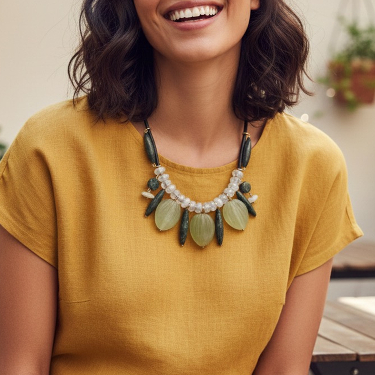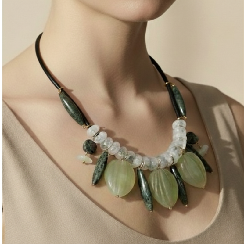 Collar Lily corto con jaspe cocodrilo, jade verde y cuarzo. -Peso 115 g -Longitud 26 cm -Metal: acero bañado en oro -Al ser materiales naturales y estar trabajados a mano, pueden variar ligeramente en tamaño, forma y color.