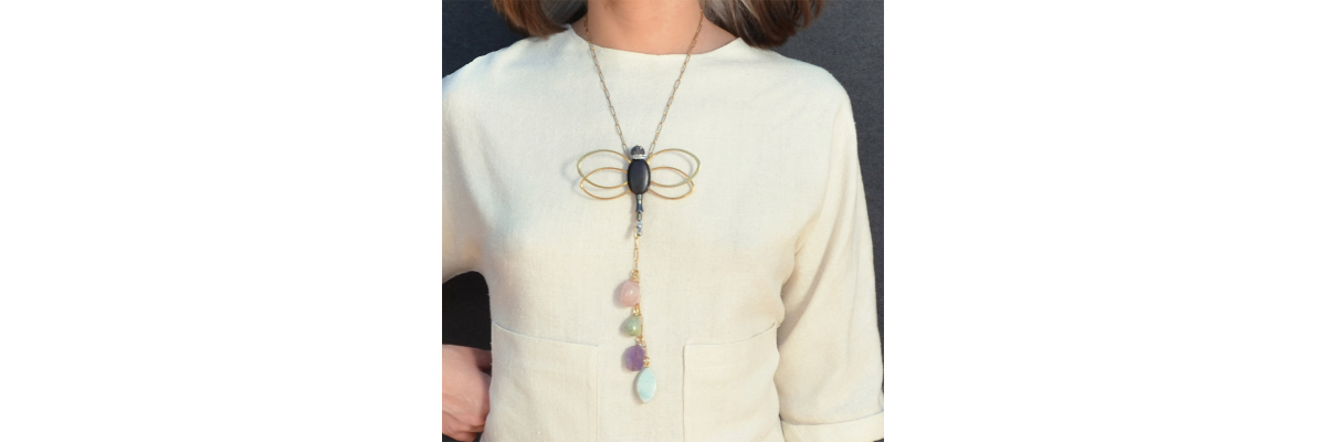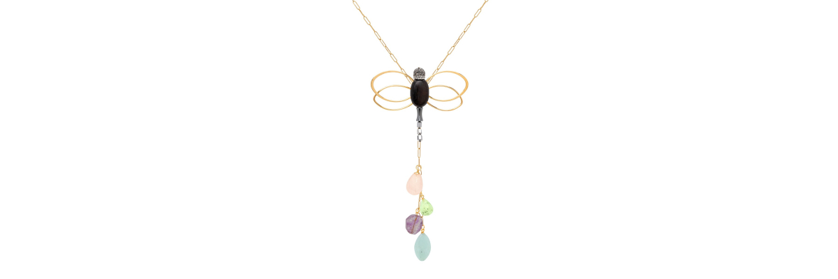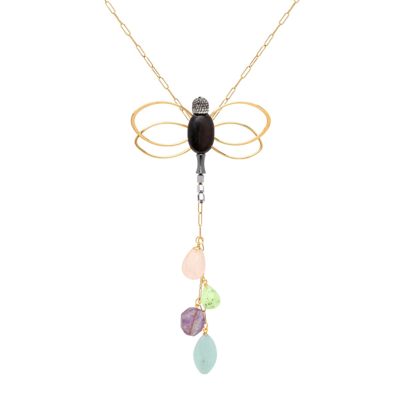 Collar Maia de cadena rectangular con una lib élula de ébano y hematite y colgantes de cuarzo, prehnita, larimar y amatista. -Peso 67g -Longitud 45 cm -Metal: acero bañado en oro -Al ser materiales naturales y estar trabajados a mano, pueden variar ligeramente en tamaño, forma y color.