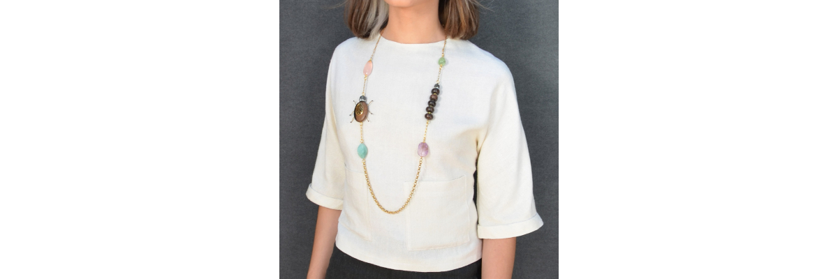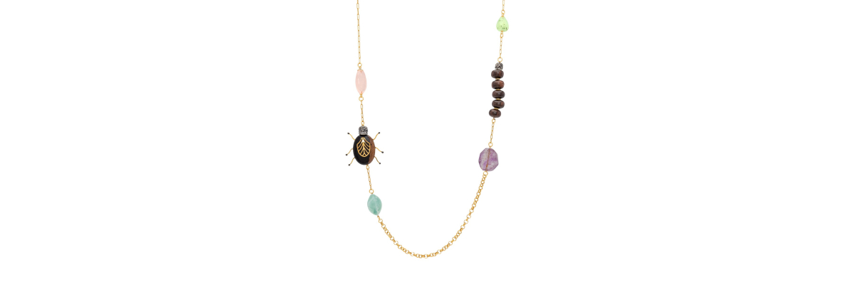 Collar Maia de cadena rectangular y redonda con un escarabajo y un gusano de ébano y hematite, y cuarzo rosa, prehnita, larimar y amatista. -Peso 86 g -Longitud 45 cm -Metal: acero bañado en oro -Al ser materiales naturales y estar trabajados a mano, pueden variar ligeramente en tamaño, forma y color.