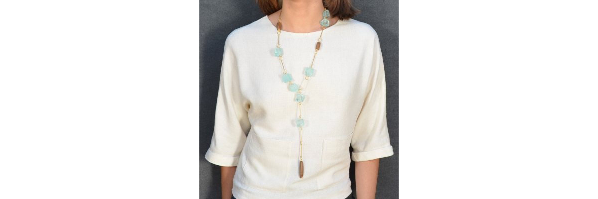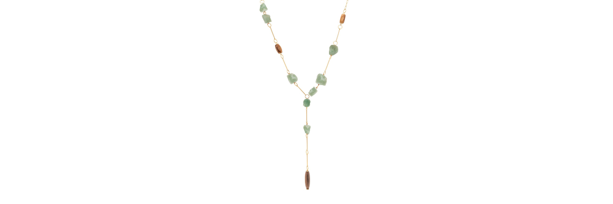 Collar Malisa en forma de Y con piedras en cuarzo color verde y madera de ébano -Peso 113 g -Longitud 26 cm -Metal: acero bañado en oro -Al ser materiales naturales y estar trabajados a mano, pueden variar ligeramente en tamaño, forma y color.