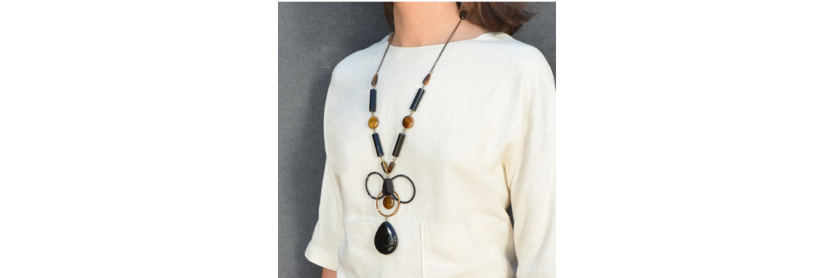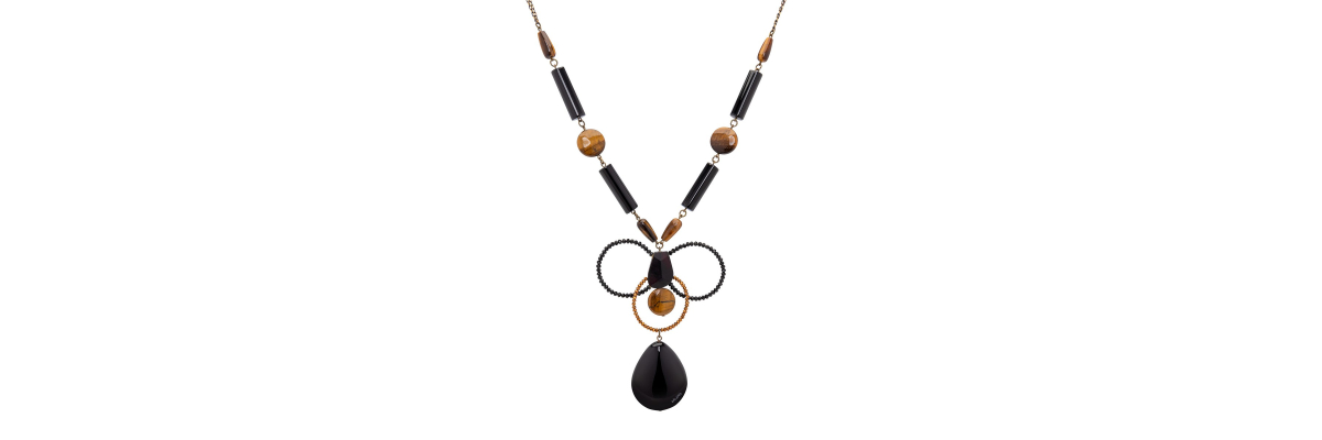 Collar Mara con ojo de tigre, ónix y adorno central de cristal de Bohemia facetado, hematite y ébano. -Peso 119 g -Longitud 45 cm -Metal: acero bañado en oro -Al ser materiales naturales y estar trabajados a mano, pueden variar ligeramente en tamaño, forma y color.