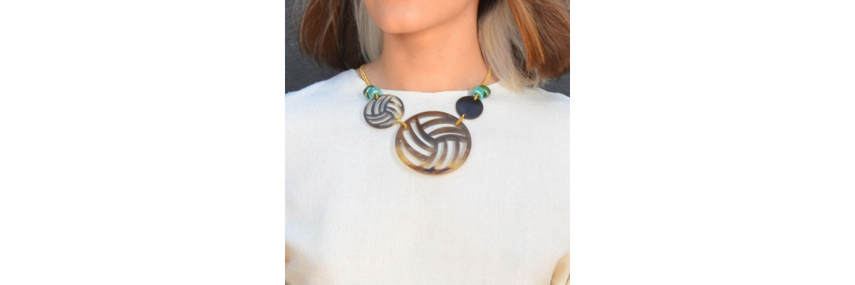 • Collar Copernico con pieza de cuerno en dos tamaños, ojo de hierro y cerámica.
