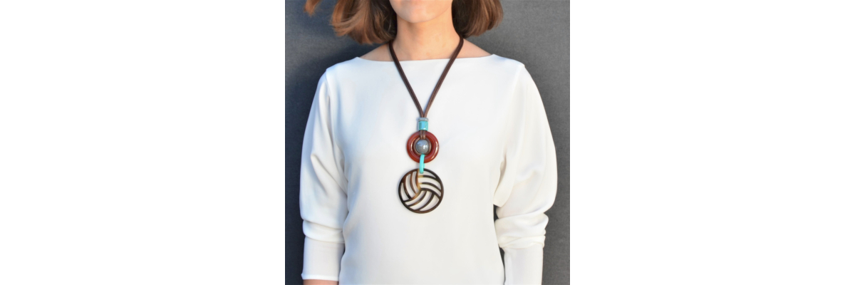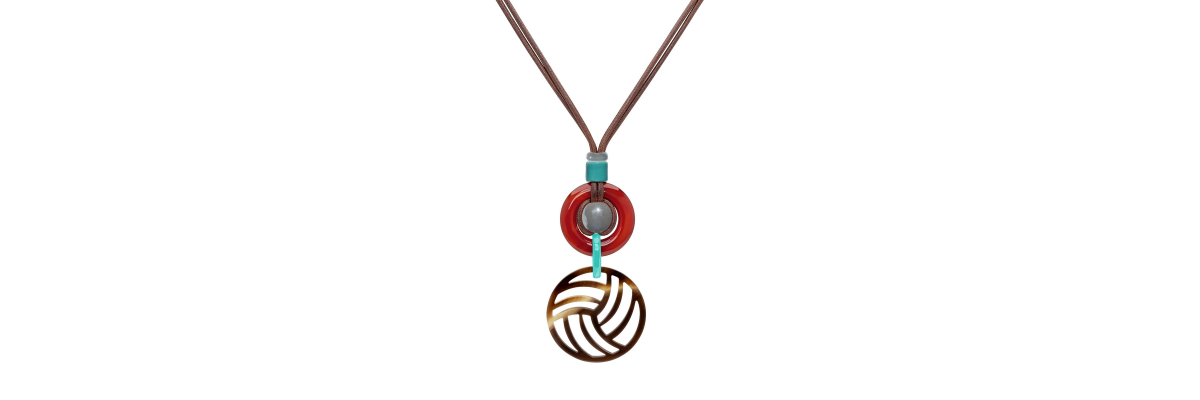 Collar Copérnico largo con colgante central de cuerno, aro de cornalina y cerámica. El collar termina en un doble cordón de algodón marrón chocolate. -Peso 86g -Longitud 44 cm -Metal: acero bañado en oro -Al ser materiales naturales y estar trabajados a mano, pueden variar ligeramente en tamaño, forma y color.