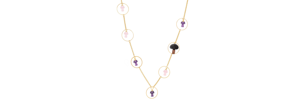 Collar largo Davinia con aros y setas de cuarzo rosa, amatista y madera de ébano. -Peso 60 g -Longitud 50 cm -Metal: acero bañado en oro -Morado/rosa -Al ser materiales naturales y estar trabajados a mano, pueden variar ligeramente en tamaño, forma y color.