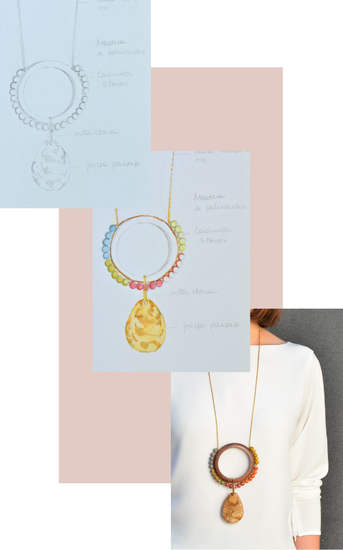 Nuestras colecciones están inspiradas en la naturaleza y sus colores, a las que le añadimos una mezcla de texturas imaginativa a través de los materiales. Priorizamos el uso de los naturales como piedras semipreciosas, cuero, nácar, madera o perlas, con la excepción de aquellas piezas que por su diseño más transgresor necesiten materiales más innovadores: