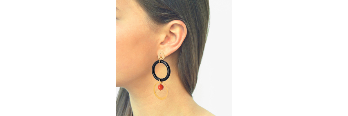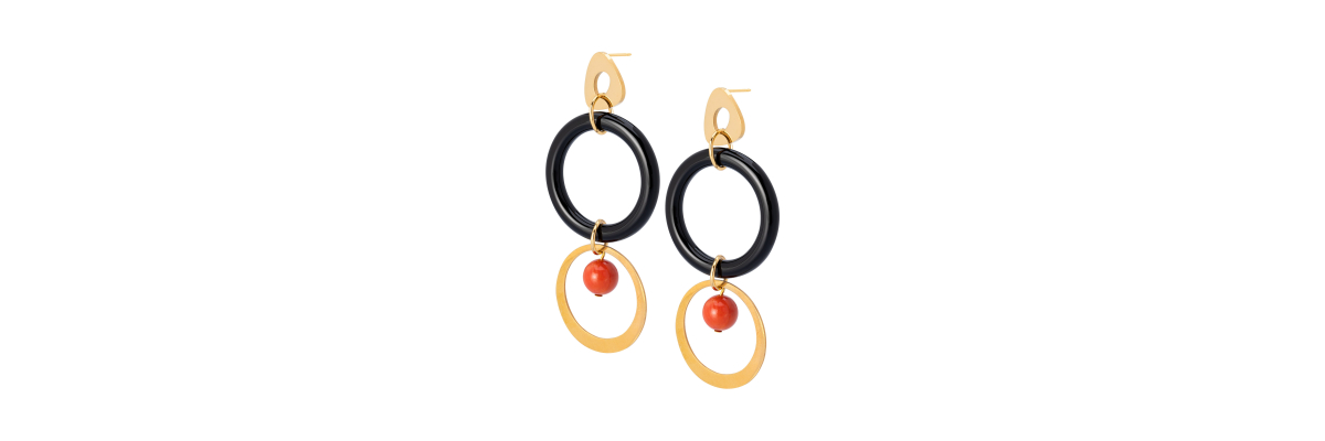 Pendiente Bel con aro grande de ónix y coral. -Peso 9 g -Longitud 8 cm -Metal: acero bañado en oro -Negro/naranja -Al ser materiales naturales y estar trabajados a mano, pueden variar ligeramente en tamaño, forma y color.