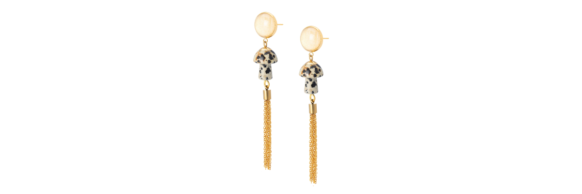 Pendientes Davinia con setas de jaspe dálmata y borla de metal. -Peso 7,5 g -Longitud 5,5 cm -Metal: acero bañado en oro -Beig/dorado -Al ser materiales naturales y estar trabajados a mano, pueden variar ligeramente en tamaño, forma y color.