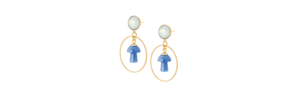 Pendientes Davinia con aro y setas de ágata. -Peso 7,5 g -Longitud 9 cm -Metal: acero bañado en oro -Azul/dorado -Al ser materiales naturales y estar trabajados a mano, pueden variar ligeramente en tamaño, forma y color.