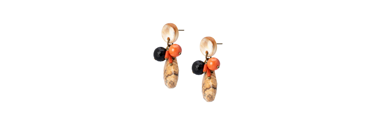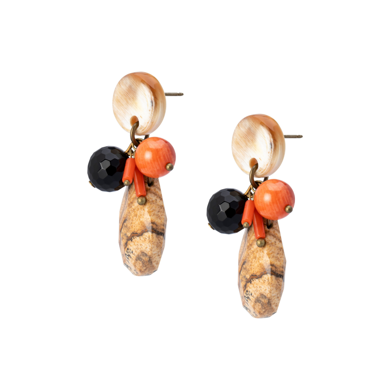 Pendientes Gaia con cuerno de búfalo, jaspe paisaje, ónix y coral. -Peso 7 g -Longitud 4,7 cm -Metal: aleación dorado viejo -Negro/beige/naranja -Al ser materiales naturales y estar trabajados a mano, pueden variar ligeramente en tamaño, forma y color.