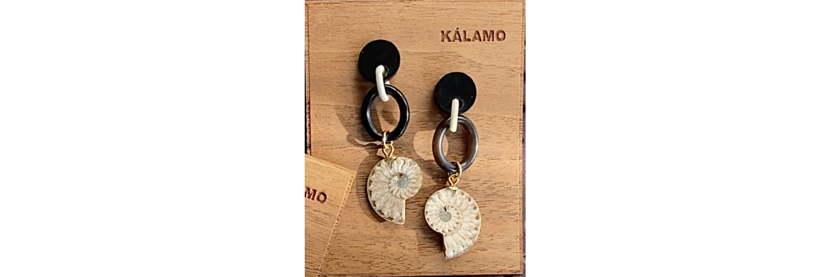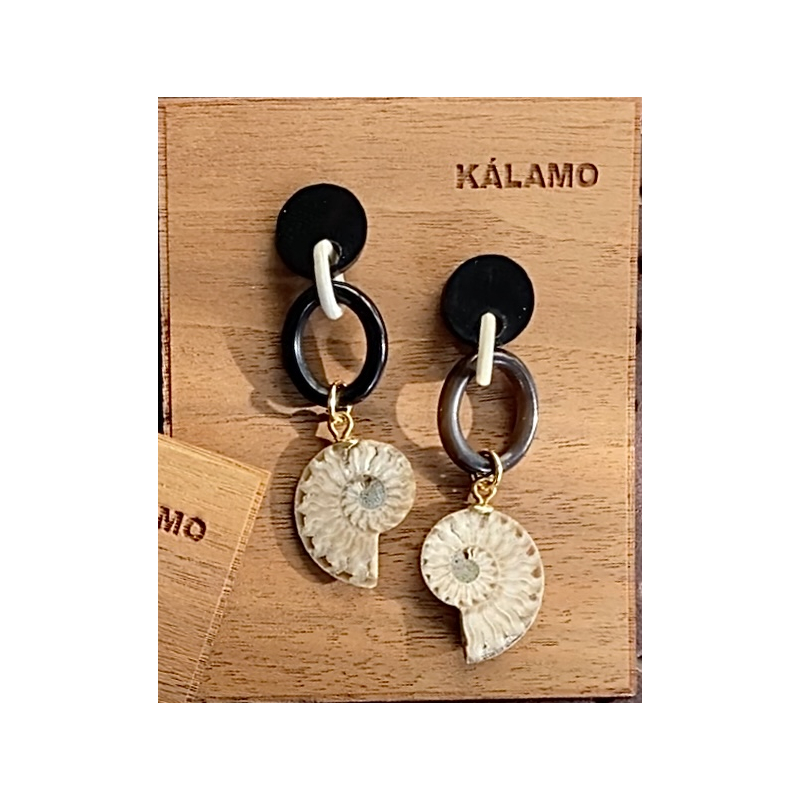 Pendientes A6523 PL con cuerno de búfalo y fósil de amonite.