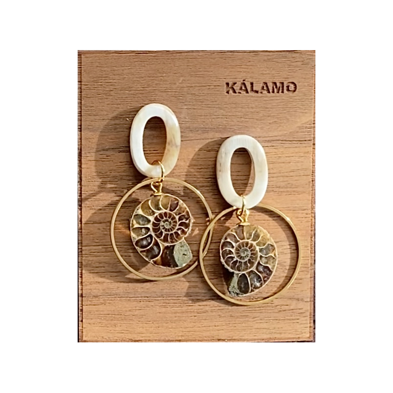 Pendientes A6523 PL con cuerno y fósil de amonite.