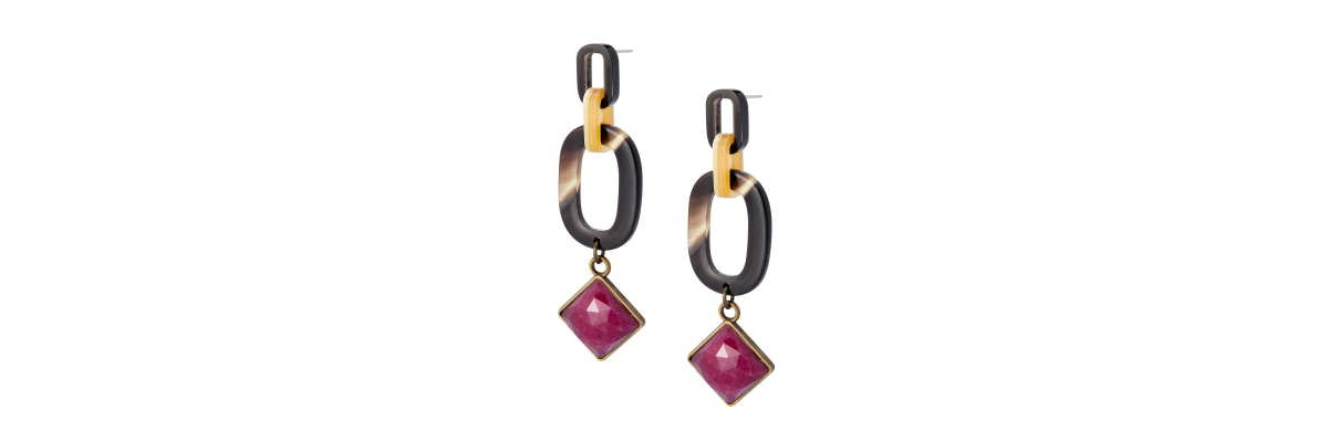 • Pendientes Alba con eslabones de cuerno de distintos tamaños y un cabujón facetado de ágata color burdeos.