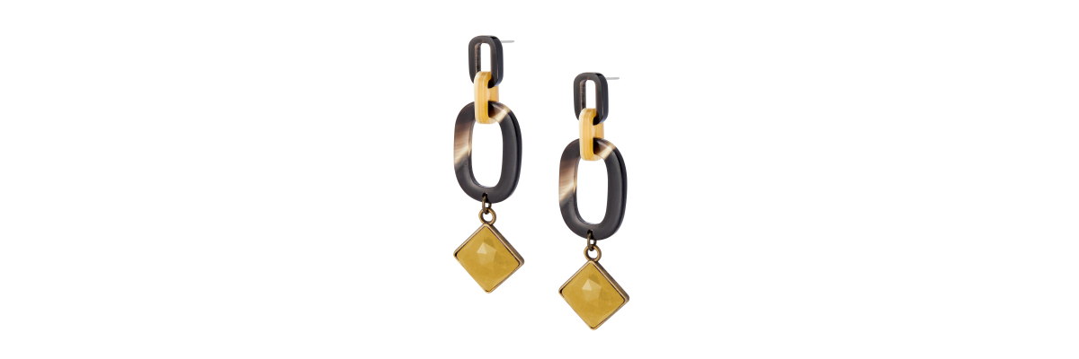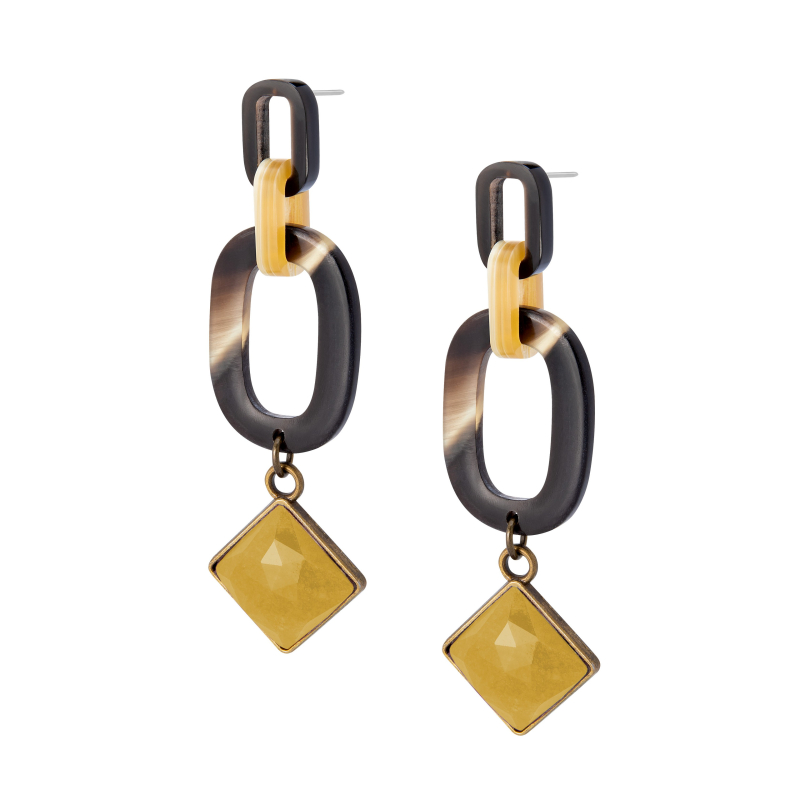 Pendientes Alba con eslabones de cuerno de distintos tamaños y un cabujón facetado de ágata color amarillo. -Peso 5 g -Longitud 7,5 cm -Metal: acero bañado en oro -Metal: old gold alloy and steel -Al ser materiales naturales y estar trabajados a mano, pueden variar ligeramente en tamaño, forma y color.