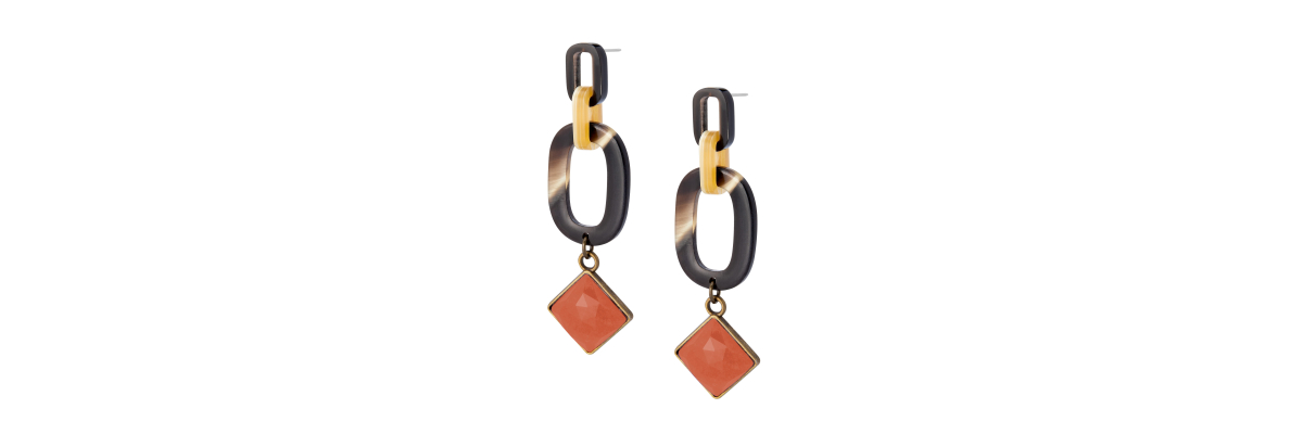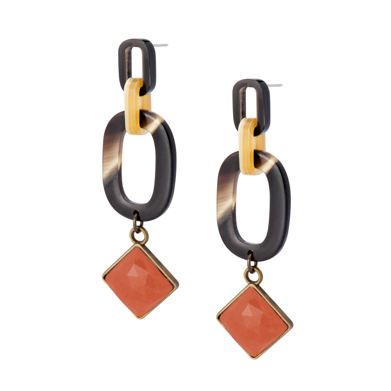 Pendientes Alba con eslabones de cuerno de distintos tamaños y un cabujón facetado de ágata color naranja. -Peso 5 g -Longitud 7,5 cm -Metal: acero bañado en oro -Metal: old gold alloy and steel -Al ser materiales naturales y estar trabajados a mano, pueden variar ligeramente en tamaño, forma y color.