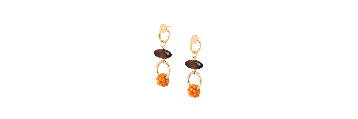Pendientes Amarella con madera de ébano, aro y una esfera tejida de coral. -Peso 5,5 g -Longitud 5,5 cm -Metal: acero bañado en oro -Al ser materiales naturales y estar trabajados a mano, pueden variar ligeramente en tamaño, forma y color.